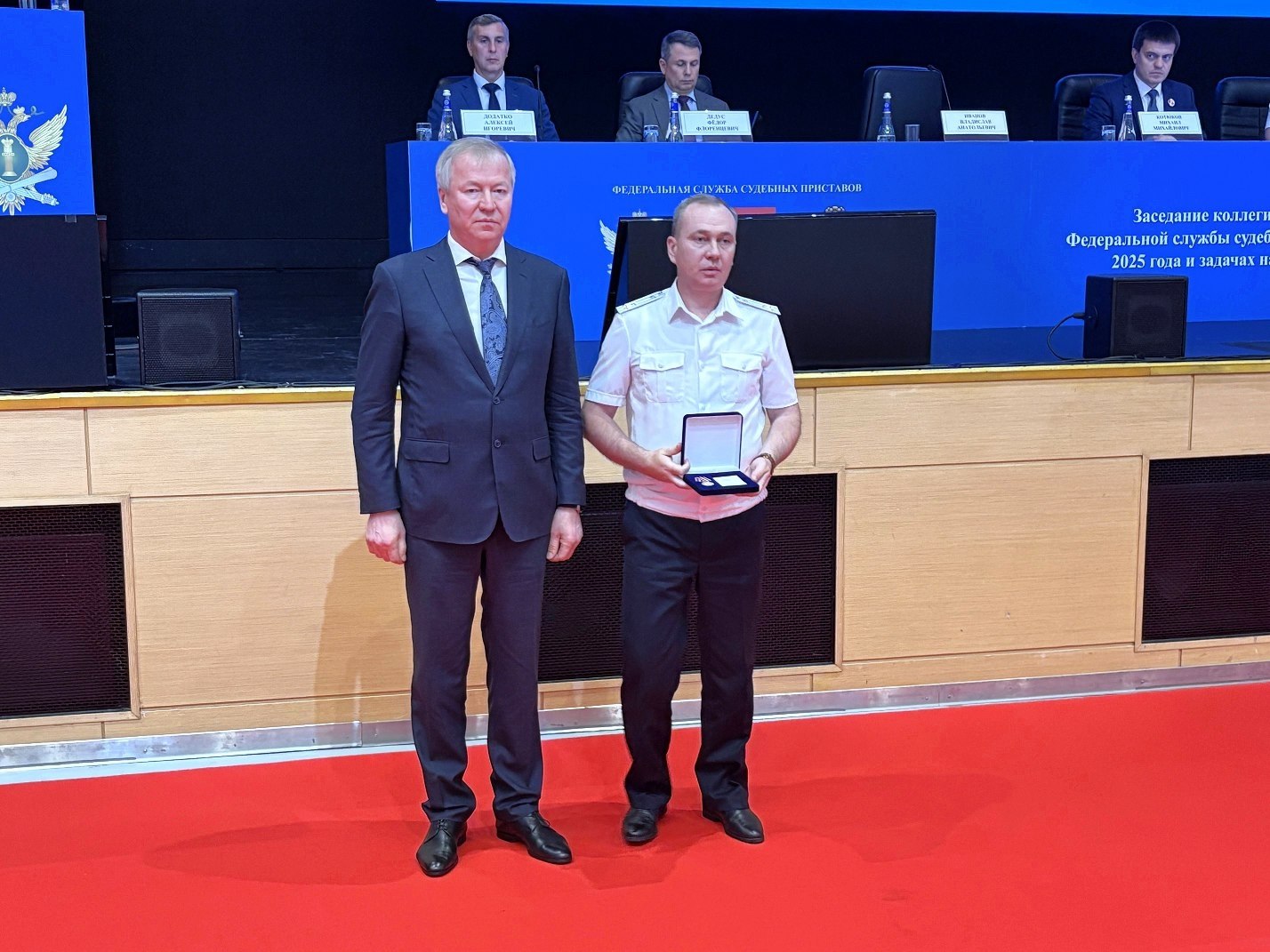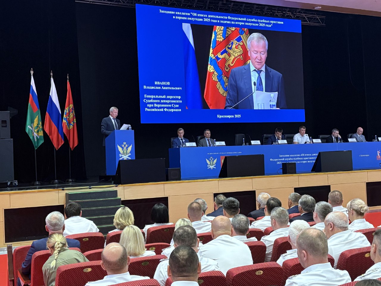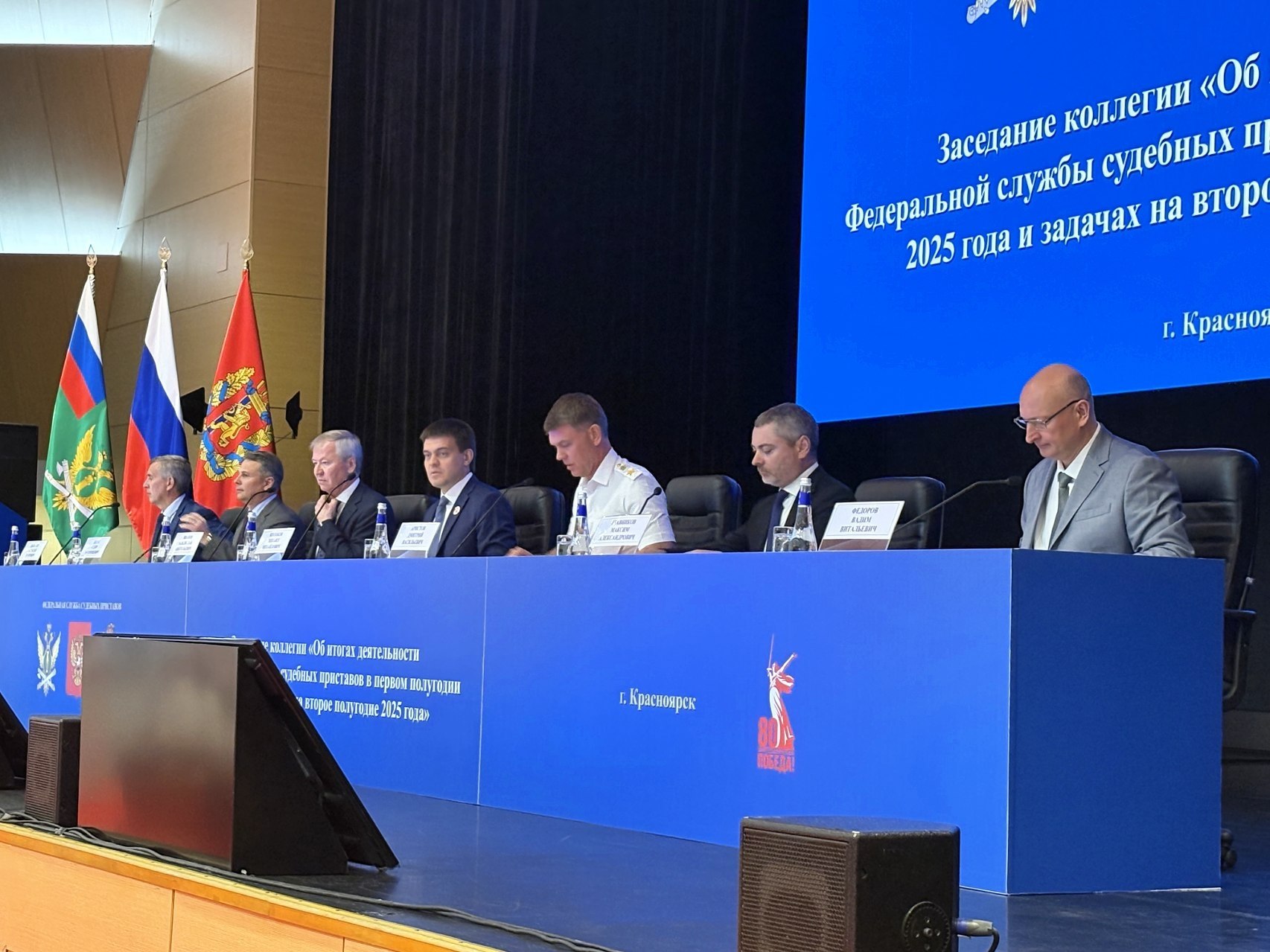 29 июля 2025 года в г. Красноярске состоялось заседание коллегии Федеральной службы судебных приставов России. В мероприятии приняли участие губернатор Красноярского края М.М. Котюков, начальник Управления Президента РФ по вопросам государственной службы, кадров и противодействия коррупции М.А. Травников, генеральный директор Судебного департамента при Верховном Суде РФ В.А. Иванов, заместитель Генерального директора Судебного департамента при Верховном Суде РФ А. Т. Ибрагимов, заместитель Министра юстиции РФ В.В. Федоров, заместитель полномочного представителя Президента РФ в Сибирском федеральном округе Ф.Ф. Дедус, главный федеральный инспектор по Красноярскому краю аппарата полномочного представителя Президента РФ в Сибирском федеральном округе С.Н. Блинов, председатель Законодательного Собрания Красноярского края А.И. Додатко, председатель Красноярского краевого суда Н.В. Фуга, начальник Управления Судебного департамента в Красноярском крае А.В. Букарин, председатель Третьего арбитражного апелляционного суда А.О. Зуев, председатель Арбитражного суда Красноярского края Л.А. Касьянова, руководитель агентства по обеспечению деятельности мировых судей Красноярского края Ю.М. Стригин и другие официальные лица.