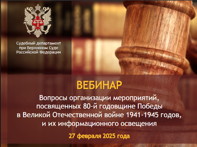 27 февраля 2025 года состоялся вебинар для государственных гражданских служащих судебной системы Российской Федерации, ответственных за взаимодействие с общественностью и СМИ, на тему: «Вопросы организации мероприятий, посвященных 80-й годовщине Победы в Великой Отечественной войне 1941-1945 годов, и их информационного освещения», организованный Судебным департаментом при Верховном Суде Российской Федерации. Вебинар проходил в прямой трансляции, участие в вебинаре приняли сотрудники Управления Судебного департамента в Красноярском крае: заместитель начальника Управления С.В. Ахметова, начальник отдела обеспечения деятельности органов судейского сообщества (далее – ООДОСС) Н.Г. Федосеенко, заместитель начальника ООДОСС А.В. Куприянова, консультанты ООДОСС Буфалова В.В. и Воронина В.В. В рамках вебинара государственные гражданские служащие ознакомились с требованиями и рекомендациями по проведению праздничных мероприятий, посвященных 80-й годовщине Победы в Великой Отечественной войне 1941-1945 годов, а также узнали о предстоящих событиях, организованных Судебным департаментом при Верховном Суде Российской Федерации. |